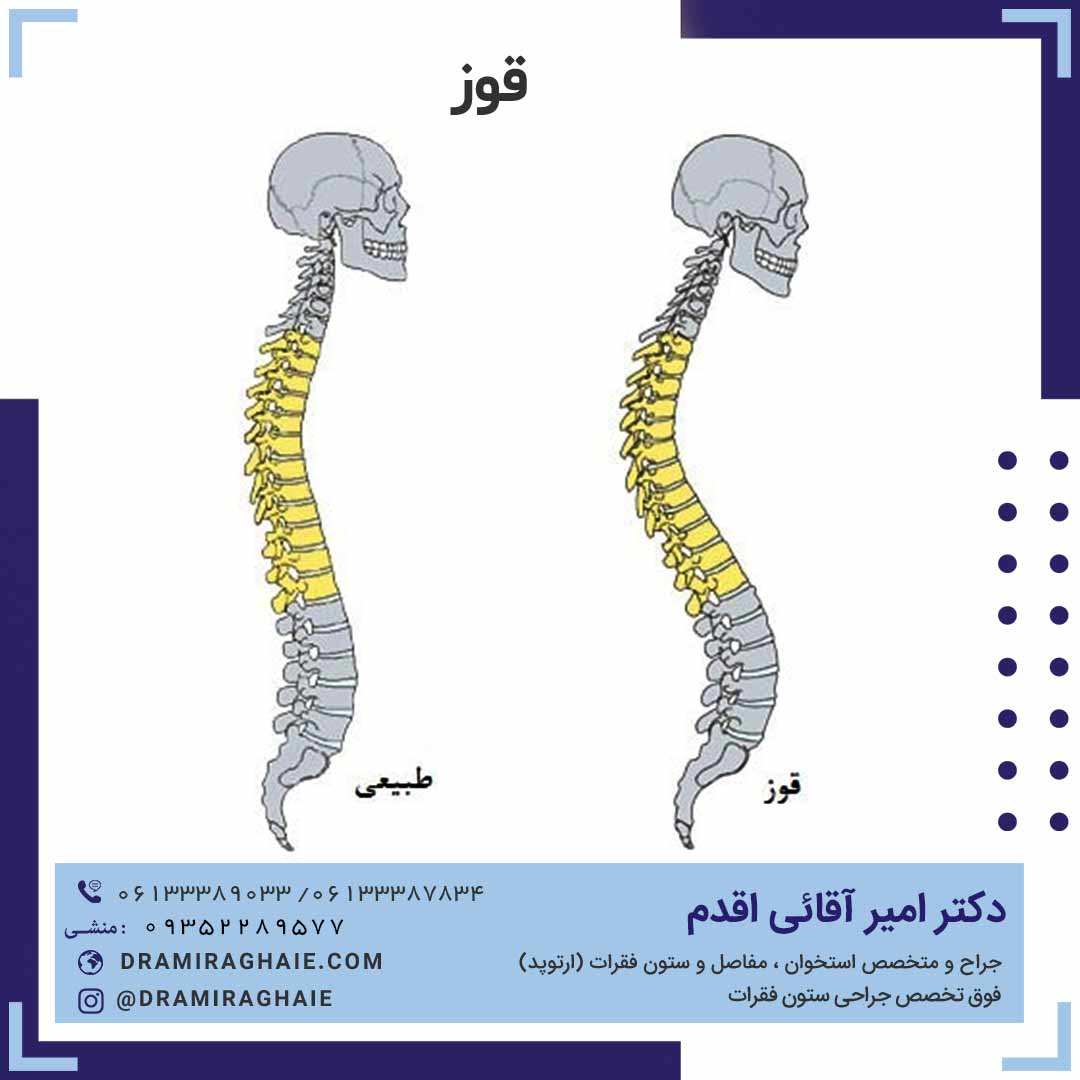 قوز کمر یا کیفوز یکی از اختلالات ستون فقرات است که در آن انحنای طبیعی قسمت فوقانی کمر بیش از حد معمول است. این اختلال می تواند باعث درد، ضعف، محدودیت حرکتی و کاهش کیفیت زندگی شود. عوامل مختلفی می توانند منجر به قوز کمر شوند، مانند وضعیت نامناسب، آسیب های قبلی، افزایش سن، خار استخوانی و بدشکلی مهره ها. در این مطلب، قصد داریم به بررسی علل، علائم، تشخیص و درمان قوز کمر بپردازیم.